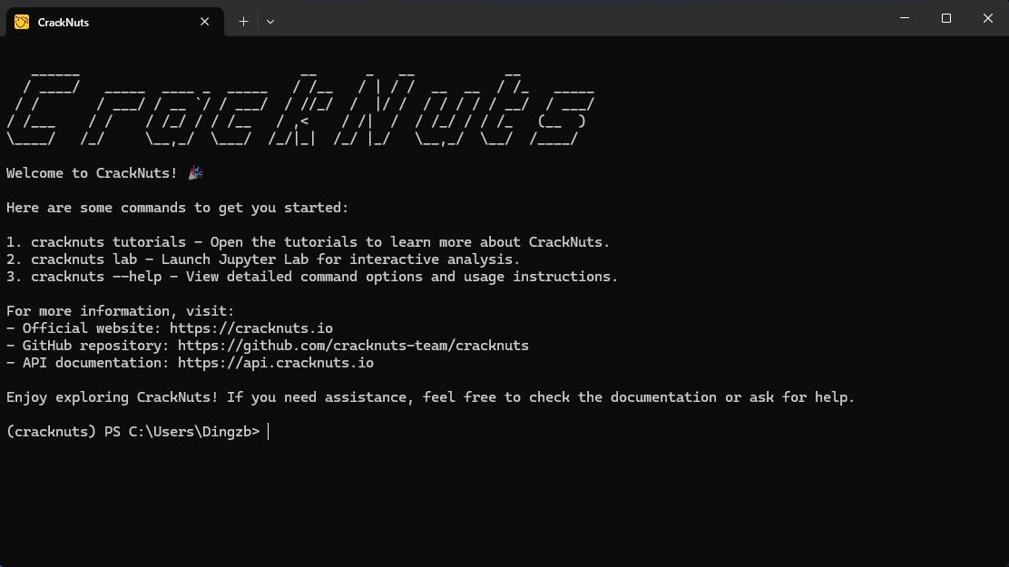 安装成功后,执行cracknuts welcome可查看欢迎信息。